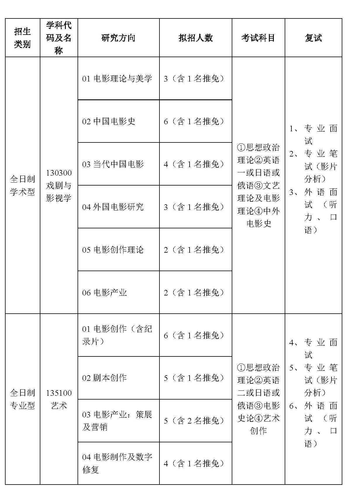 4.初试科目:学术型硕士(MA)考试科目为①思想政治理论②英语一或日语或俄语③文艺理论及电影理论④中外电影史。专业型硕士(MFA)考试科目为①思想政治理论②英语二或日语或俄语③电影史论④艺术创作。每门科目的考试时间为3小时,思想政治理论和外国语满分均为100分,业务课一和业务课二满分均为150分。(考试范围参见链接https://www.cfa.org.cn/yjsjy/tabid/417/InfoID/6275/frtid/383/Default.aspx)