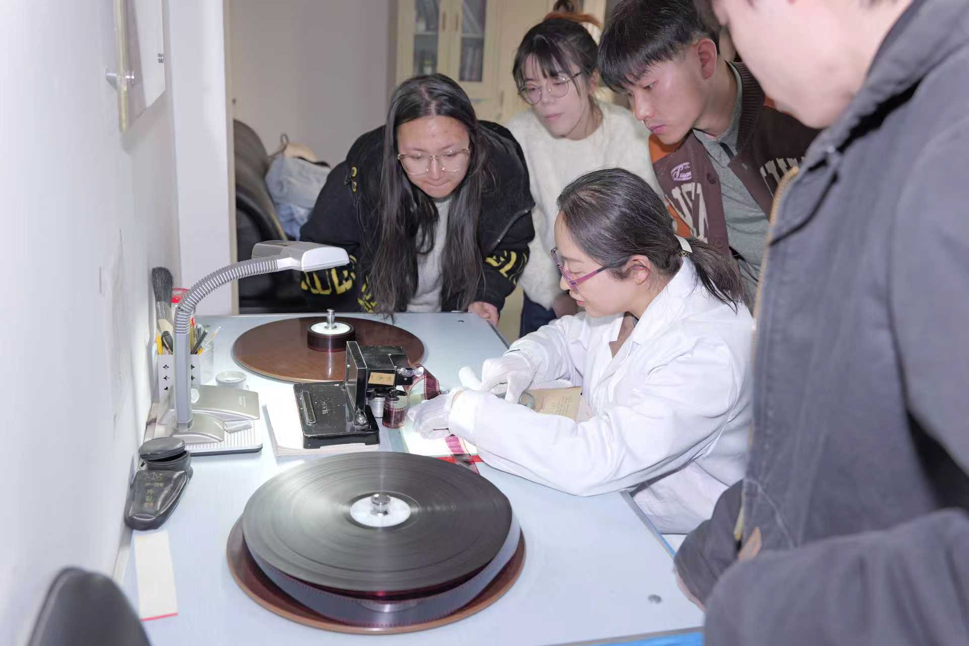在修复车间,同学们亲身上手,体验醋酸片和涤纶片的修补与接片等物理修复技术。在洗印车间,同学们系统学习胶片洗印的设备与洗印流程,并在工作人员的指导下对经典影片《庐山恋》的小底进行配光。通过实操学习,同学们切身感受到西安电影资料库工作人员对胶片资料的珍视,体悟到“精心修复,影像长存”这一理念背后的责任与意义。
