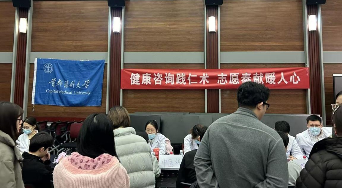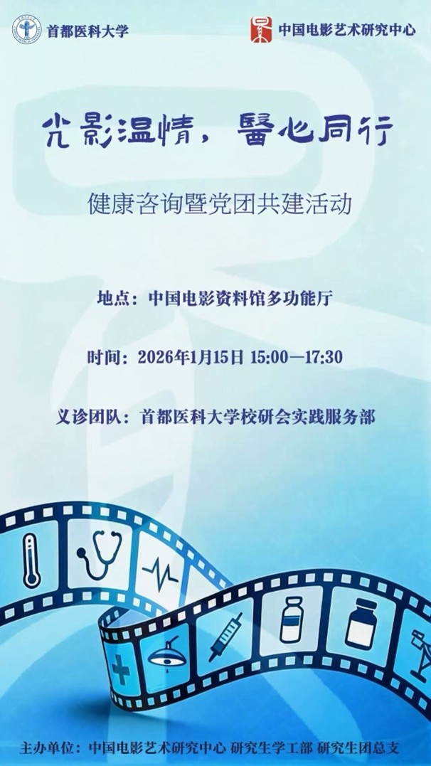 2026年1月15日下午,我中心研究生学工部、研究生团总支邀请首都医科大学的青年医师来到小西天,参观馆内常设展览“旗帜引领·光影华章”——中国共产党领导下的中国电影发展历程展,后共同举办健康咨询活动。满墙的“光影温情,医心同行”海报让活动现场闪亮温馨,首都医科大学校研会实践服务部的二十名持有执业医师资格证的硕士、博士研究生,为我中心同学、职工提供了专业的义诊咨询深受欢迎。
